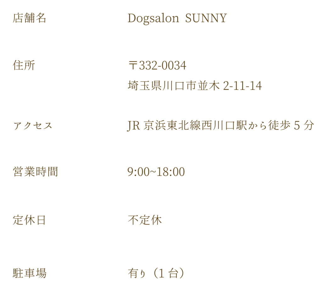 わんちゃんにやさしい、しあわせトリミングサロン わんちゃんにやさしい、しあわせトリミング大好きな人に会いに行くように、わんちゃんが喜んで来てくれるサロンをつくっていきます。その日の体調や気持ちを大切にし、無理をせず、苦手な事は少しずつ、そして愛情を込めてトリミングを行います。可愛さはもちろん、暮らしに寄り添ったカットスタイルで、特別なエステのような時間を日常の中に。愛情たっぷりの時間で、可愛いだけじゃない“しあわせ”を一緒に。 SHOP