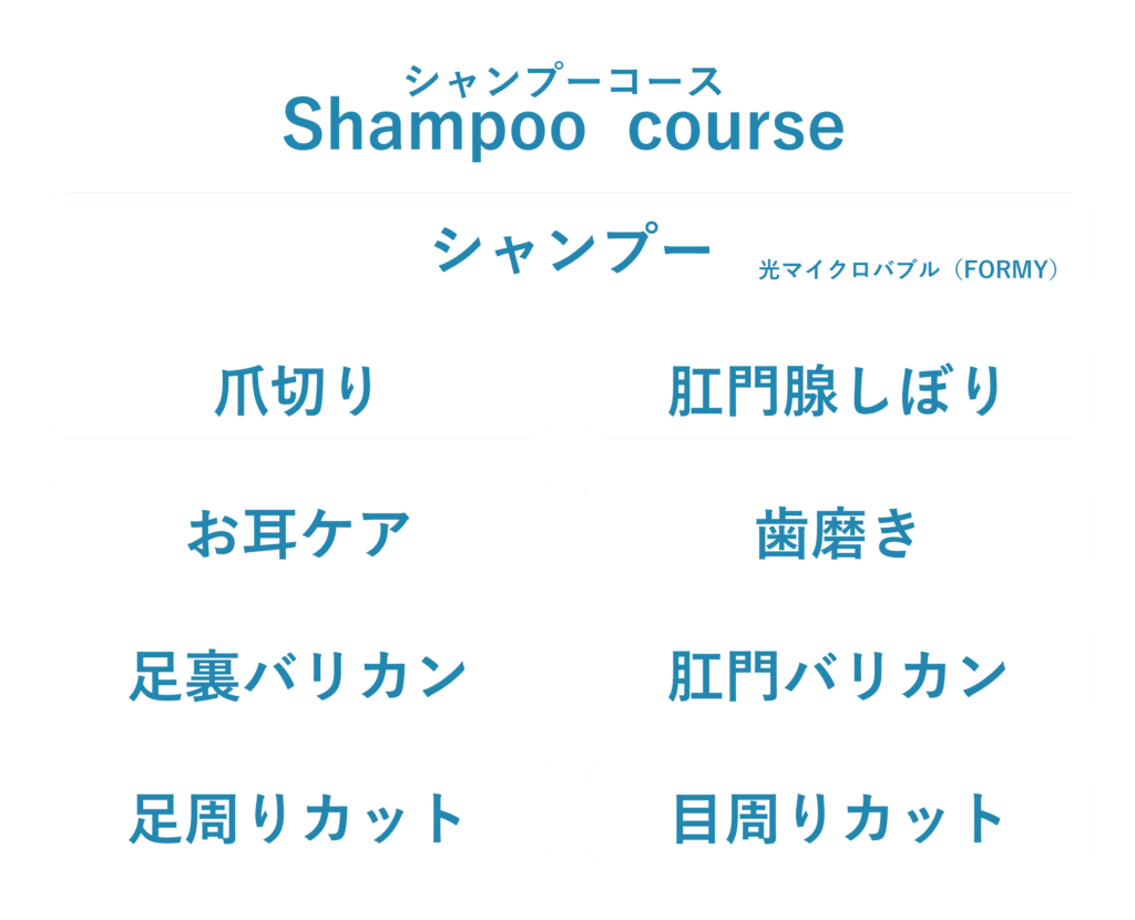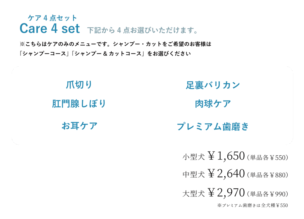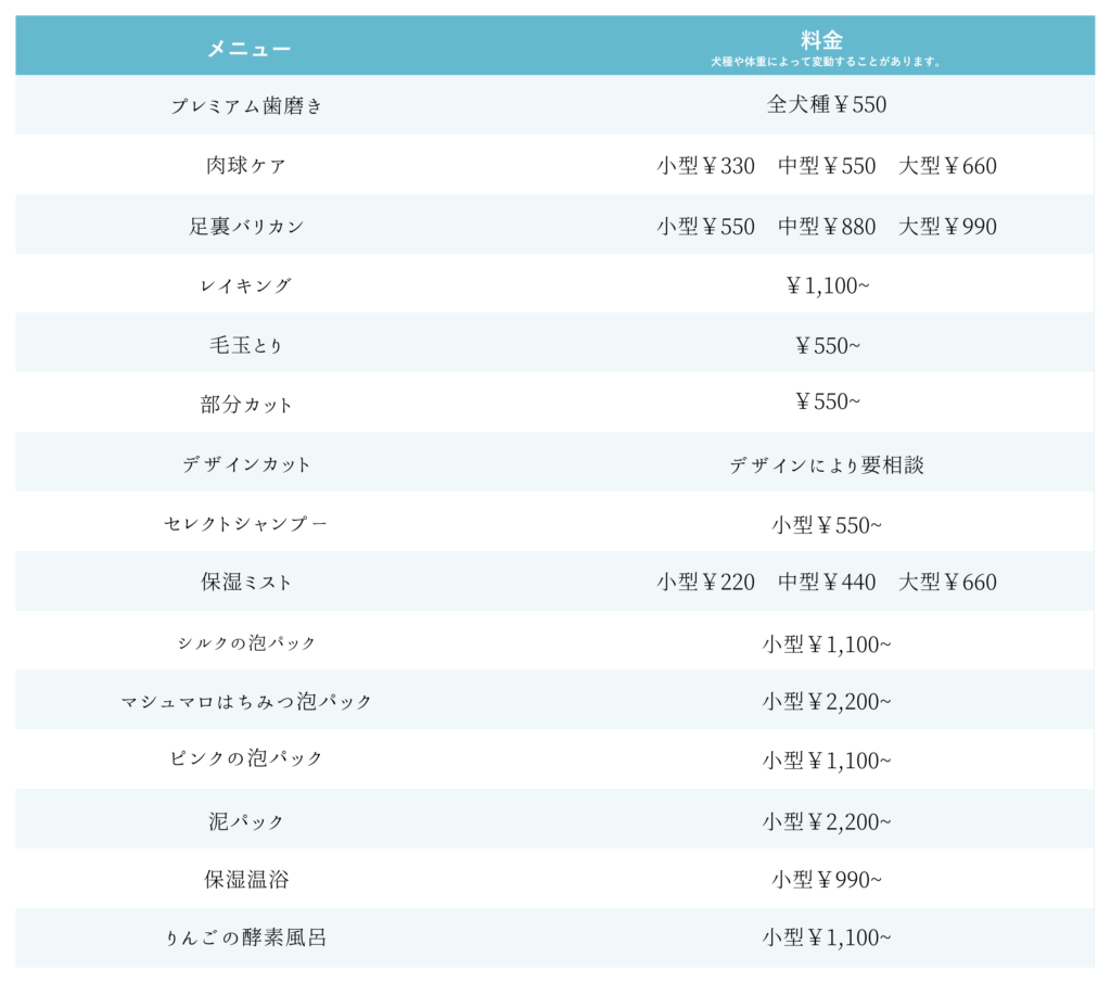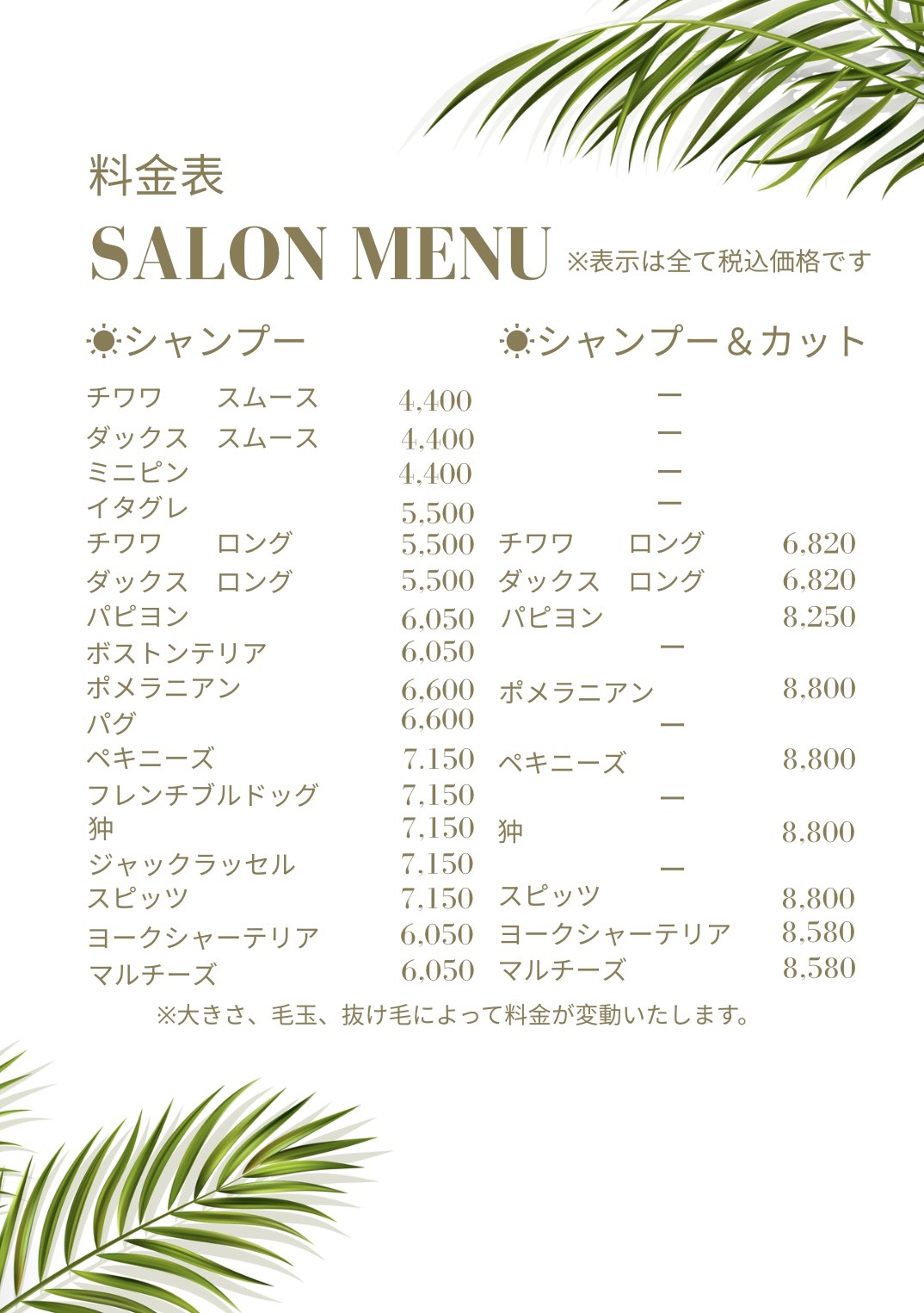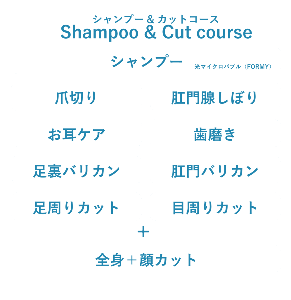 Price 当店では以下のコースをご用意しております。 大きさ、毛玉、抜け毛(毛量)で料金が変動することがございます、あらかじめご了承ください。 コース内容 ケアカットメニュー オプション(単品)メニュー スペシャルメニュー